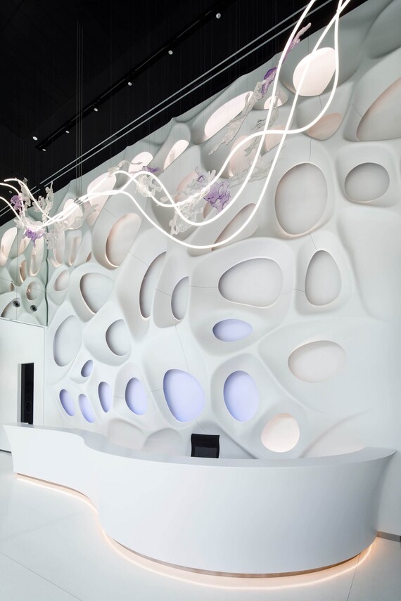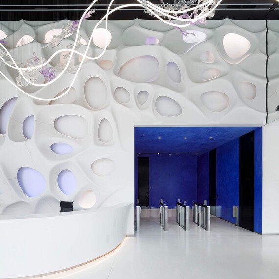 Architects Eva Jiřičná and her colleague Petr Vágner from the AI - DESIGN studio wanted to create an original and transparent building, and this was made possible by the all-glass facade. Eva Jiřičná’s signature style is also evident in the entrance lobby, where the bionic backlit wall made of Corian and monumental reception desk immediately catch the eye. The modern sculptures were created by the Brno-based A.M.O.S. DESIGN studio using designs by architect Eva Jiřičná. She also incorporated artificial intelligence into modelling the wall. The profiled wall is complemented by an illuminated glass sculpture by the Lasvit glassworks. This object was also designed by Eva Jiřičná. All three elements - the bionic wall, reception desk and sculpture - are inspired by water as the essence of life (the bubbles in the wall, the reception desk wave and the flowing water of the chandelier) and thus link to the wave-shaped sunshades on the southern facade of Arché.