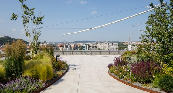 However, the building’s appeal is not limited only to its attractive appearance. The architectural design likewise focused on efficient and flexible use of space and economical operation. The building also includes a spacious shared terrace. Nor have environmental considerations been overlooked. The building aims to achieve the highest LEED Platinum sustainability certification. For example, the complex features energy-efficient LED lighting that responds to the intensity of the ambient light, heating is provided by low-rise radiators along the windows, and the south facade offers wave-shaped sunshades symbolising the flowing Vltava River near the building. The underground car parks have chargers for electric cars and electric bikes. The building features the latest technologies. For example, the access system allows entry using both standard cards and phones supporting NFC or Bluetooth. Entry and exit from the garage uses number-plate recognition.