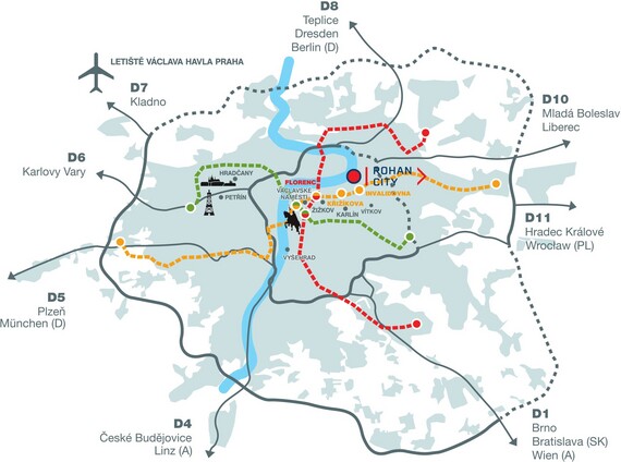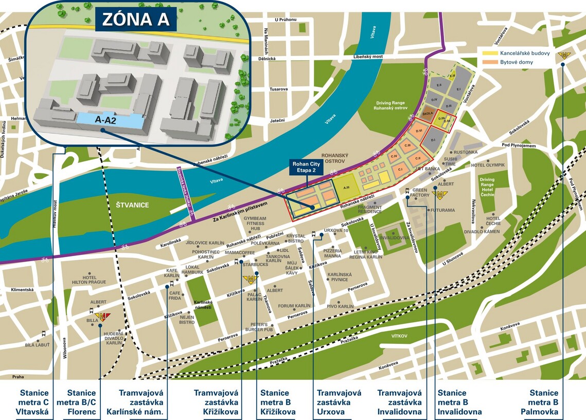 The A-A2 administrative building will be easily accessible by public transport and by car. Two metro stations, Invalidovna and Křižíkova, and tram stops for lines 3, 8 and 24 are within walking distance. All of Prague’s main transport arteries are also within easy reach. Rohanské nábřeží street provides direct access to the centre of Prague, while the inner city ring road connects Karlín to the motorway network.