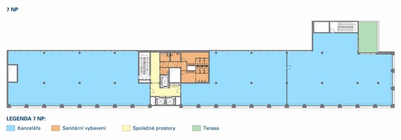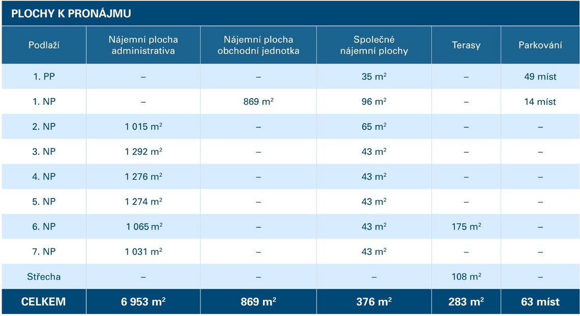 The A2 administrative building forms a single block situated along Rohanské nábřeží street, separated from traffic by a pedestrian walkway and a green belt. On the west side, the building connects to the A1 administrative building, while on the east side it is adjacent to a residential building. The northern facade of the building faces an inner courtyard garden. The building has seven above-ground and one underground floor. The above-ground floors contain leasable office and commercial space, while the underground one contains parking spaces. The street-facing facade is designed as a regular orthogonal structure. The main entrance with its adjacent reception area is located on Rohanské nábřeží street. The buildings offer standard A offices, but also additional amenities: terraces with panoramic views and facilities for sportspeople and cyclists.