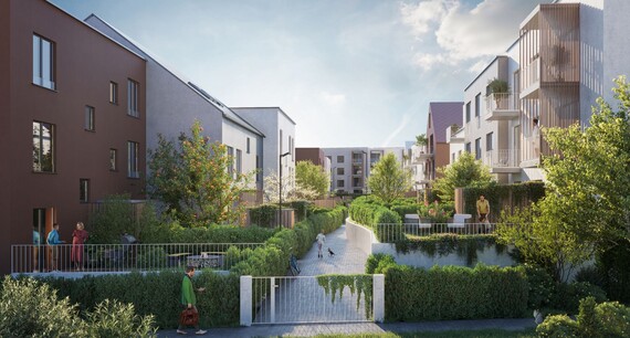 Residence D is a combination of an urban building with a distinctive south-facing loggia opening onto the park and a fragmented structure of individualised villa houses.