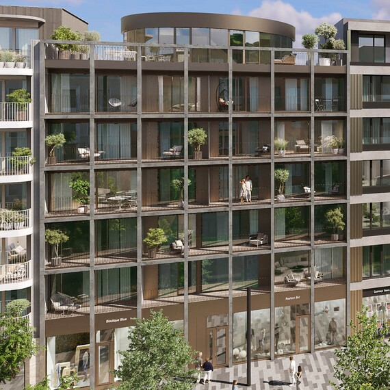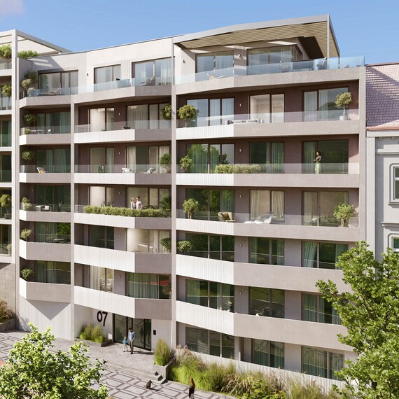 Section 07 faces south with views of the adjacent park and Smíchov railway station. The upper floors will offer beautiful views of Vyšehrad and Podolí. The main facade consists of generous polygonal loggias with large windows that allow maximum connection between the interior of the residential units and the park. The secondary facade is slightly broken up along the vertical axes. In addition to these loggias, section 07 is unique in its use of colours on the facade. These colours are used on the recessed walls of the loggias and window frames. They darken towards the top, subtly accentuating the horizontal character of the facade, with the gradation of the colour tone emphasising the unique character of the building. Greenery forms an important part of the building, and features on both the ground level and in the entrance area.